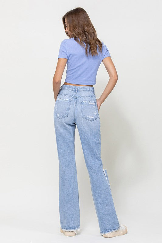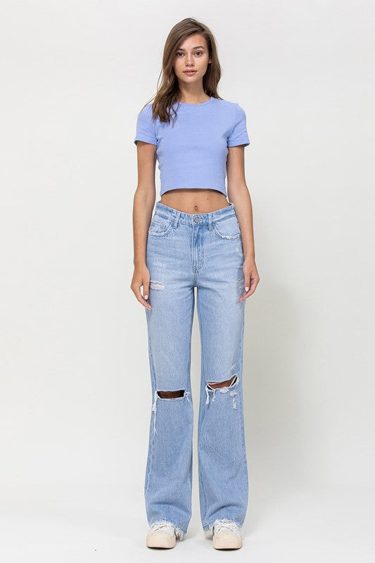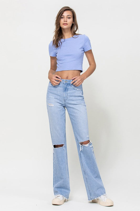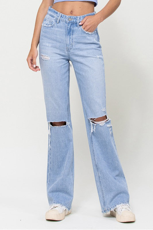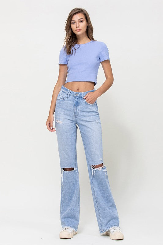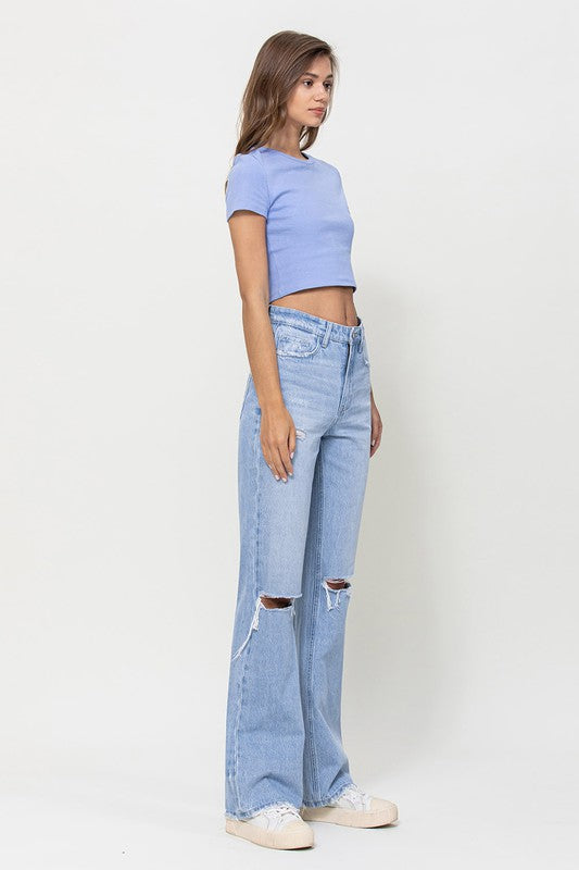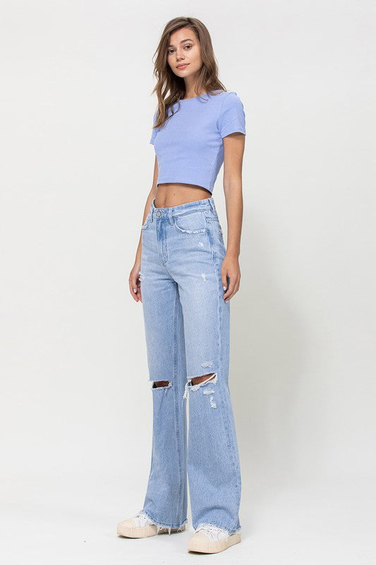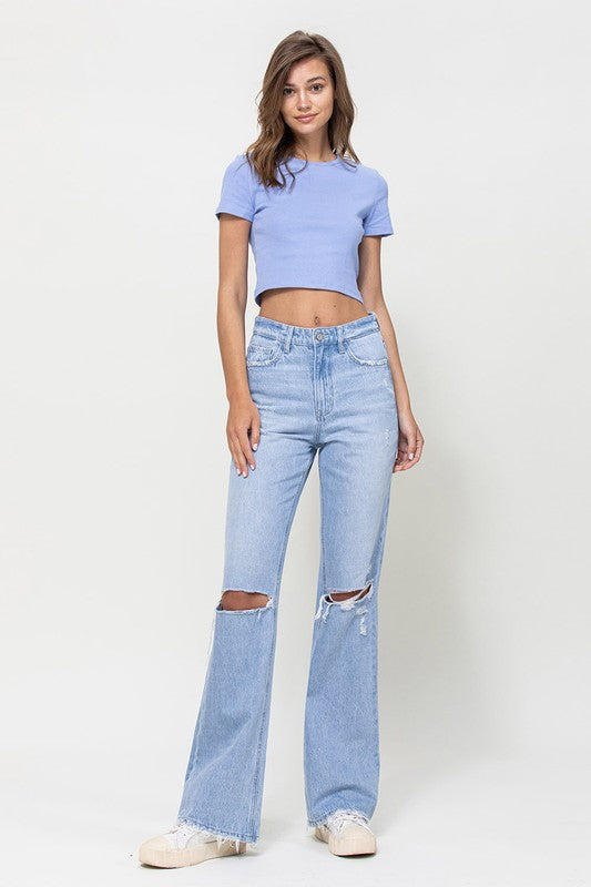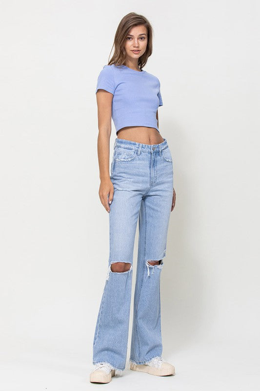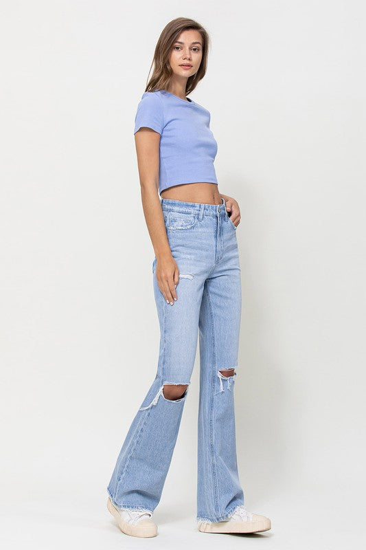 Crafted from non-stretch denim, these jeans capture the essence of the era with distressed detailing and a super high-waisted fit. The relaxed legs and wide flare design evoke a sense of nostalgia, while the authentic rigid jeans texture adds to their vintage appeal.