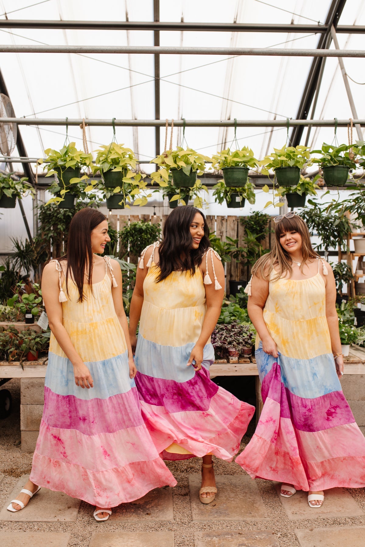 That beach vacation is calling your name, and the Caribbean Crush Dress is coming with! A lightweight, rayon fabric shapes this unique, tiered maxi dress. Composed of an a-line silhouette, detailed in a rainbow tie-dye, with braided rope detail for the straps. This dress makes a statement on it's own, pair with simple sandals and some sunnies and you're ready to go!