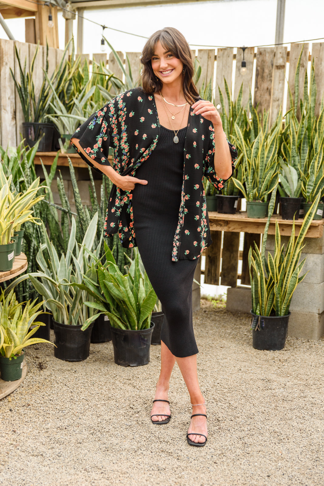 Turn every head in the room with the help of the Classy Gal Black Dress! A stretchy ribbed knit fabric shapes a sweetheart neckline with spaghetti straps, midi length, and side slit. This curve-hugging fit will have you reaching for this dress on repeat! Pair with heels and an oversized blazer for a chic date night look!