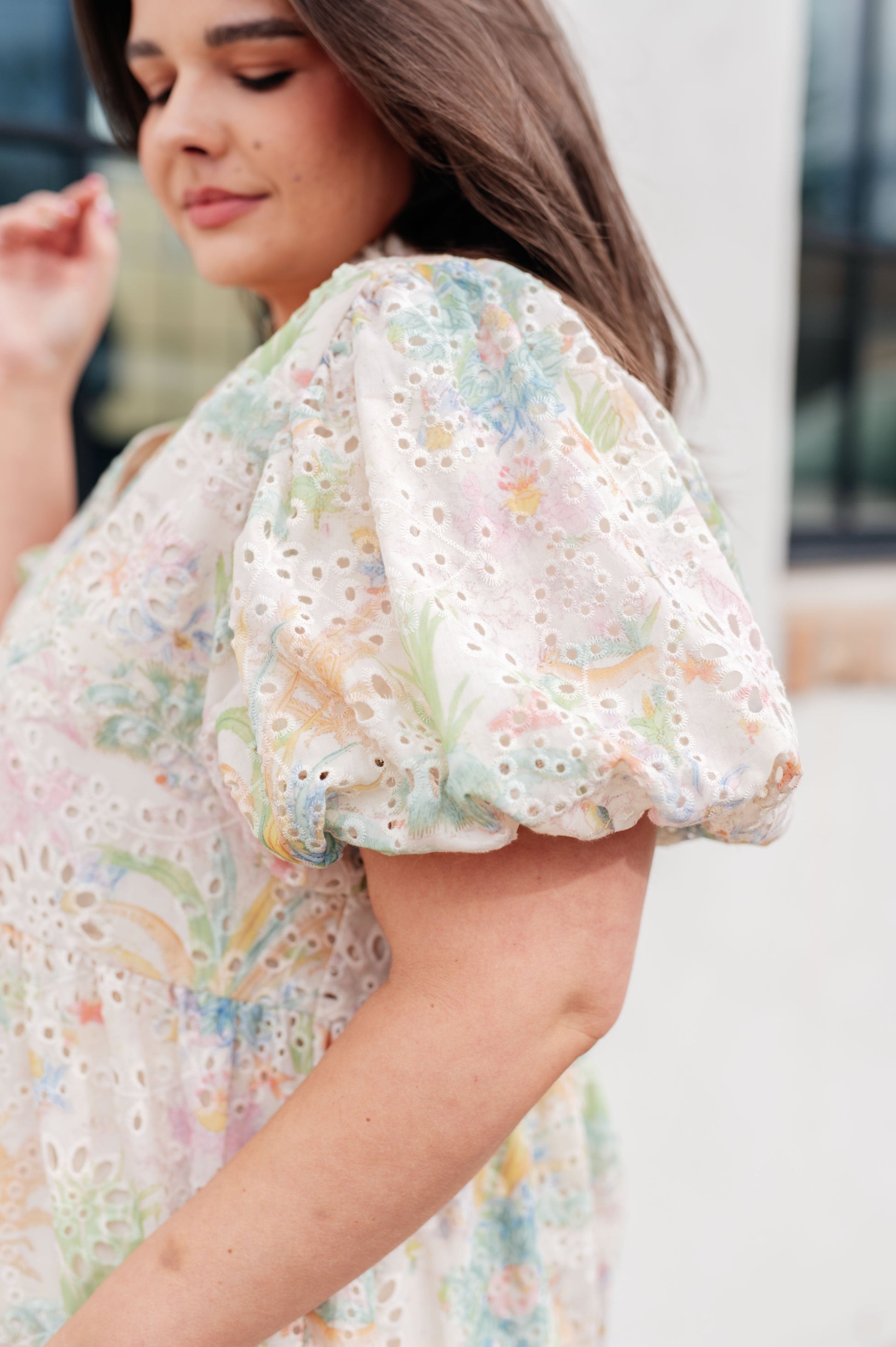 Get ready to stand out at any event with this adorable Finger Sandwiches Eyelet Dress! The ruffled V-neckline adds a touch of femininity, while the balloon sleeves and elastic cuffs provide a playful yet comfortable fit. Plus, the fully lined design and front button closure make it both stylish and practical. Perfect for any occasion!