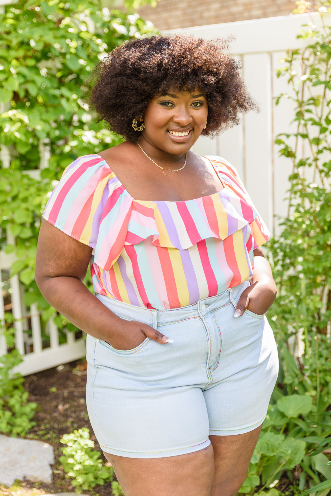 You know it's time for the It's Electric Striped Shirt when that summer sun comes out! We can't get over these fun colors that come together to create a vertical striped pattern, a square neckline, ruffle overlay and flounce short sleeves.