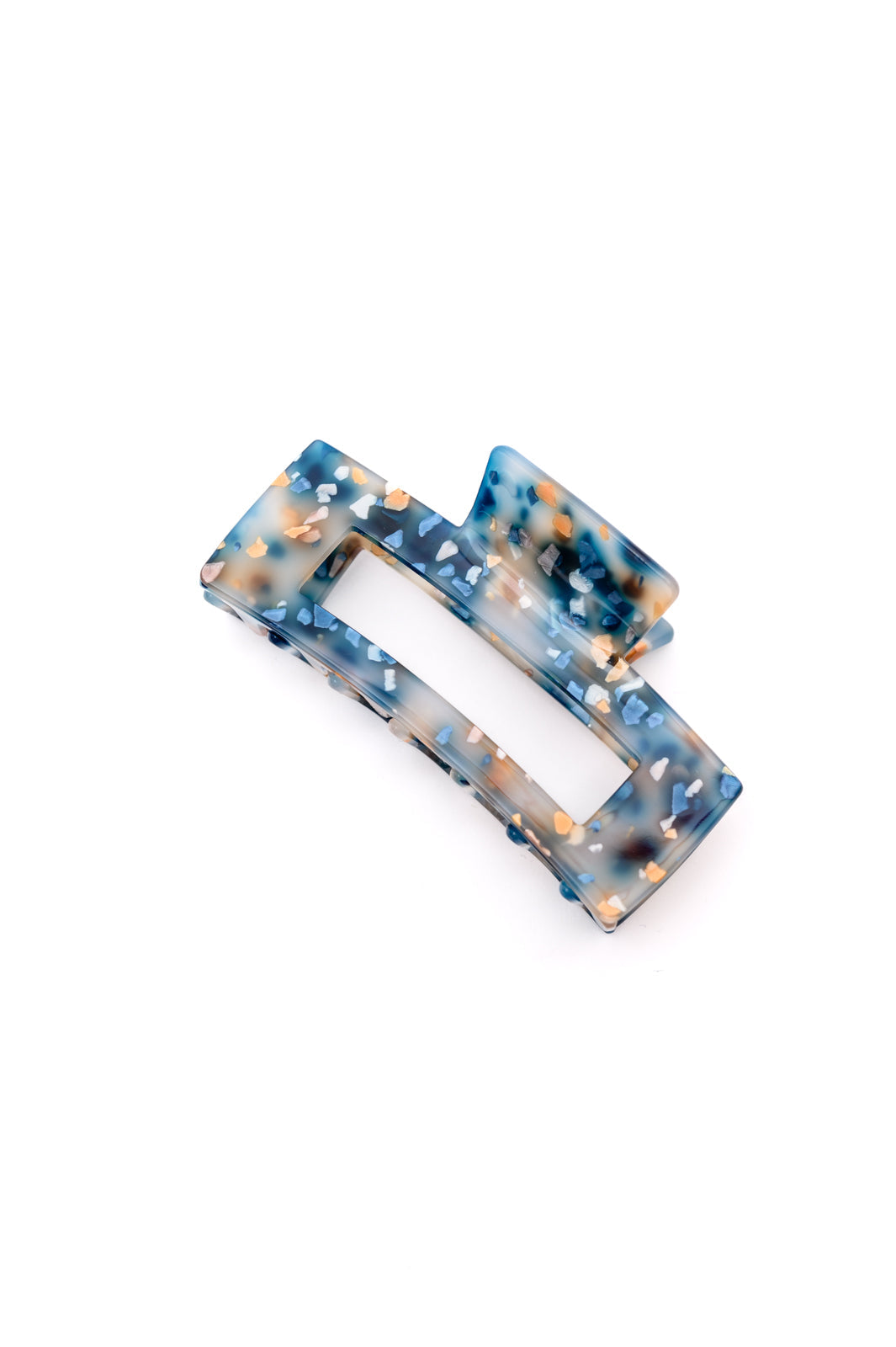 The Life's A Party Confetti Claw Clip In Teal is a large size acrylic claw clip with strong interlocking claws, a sleek squared rectangle shape, and fun, confetti-like teal details.