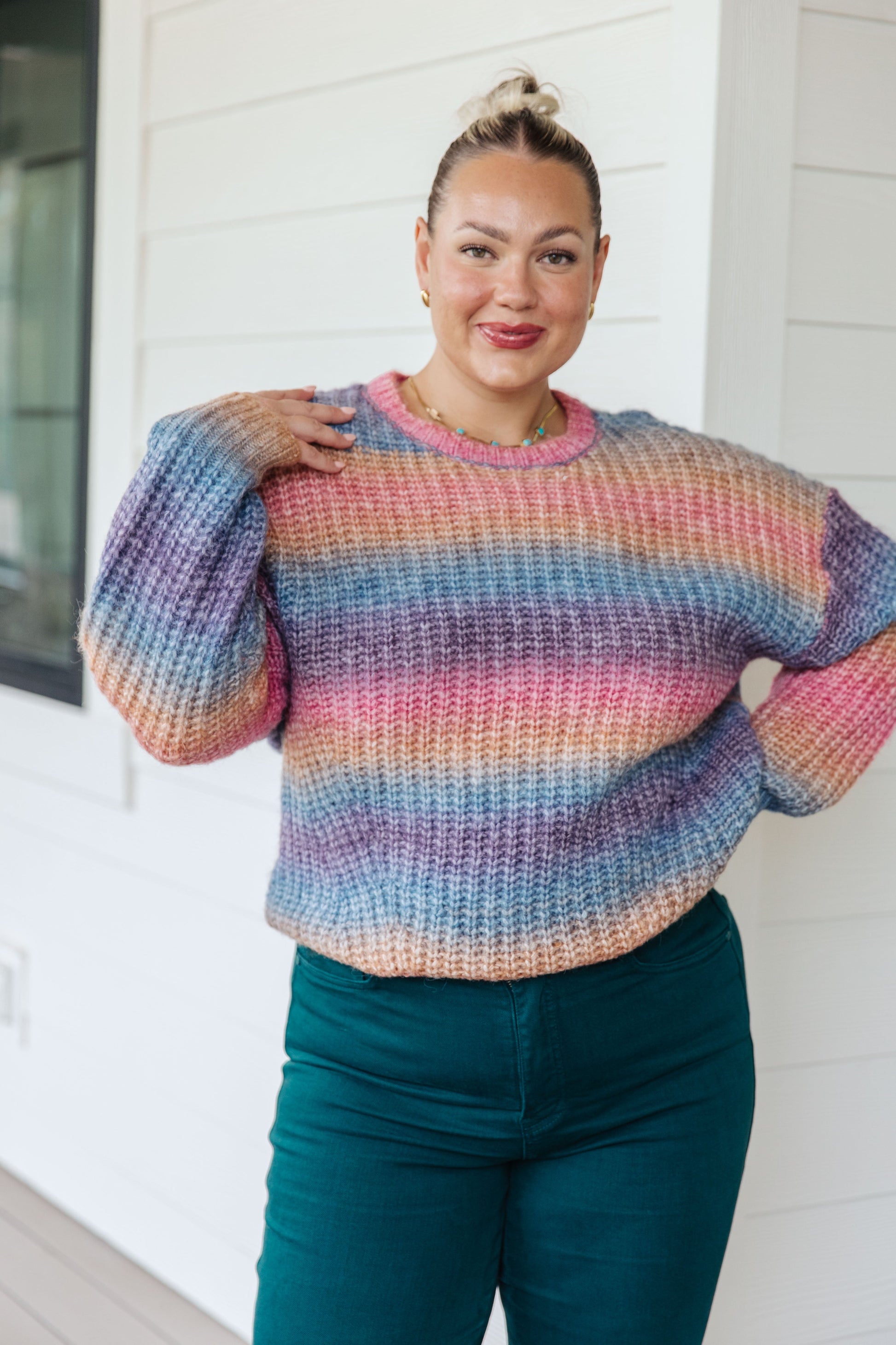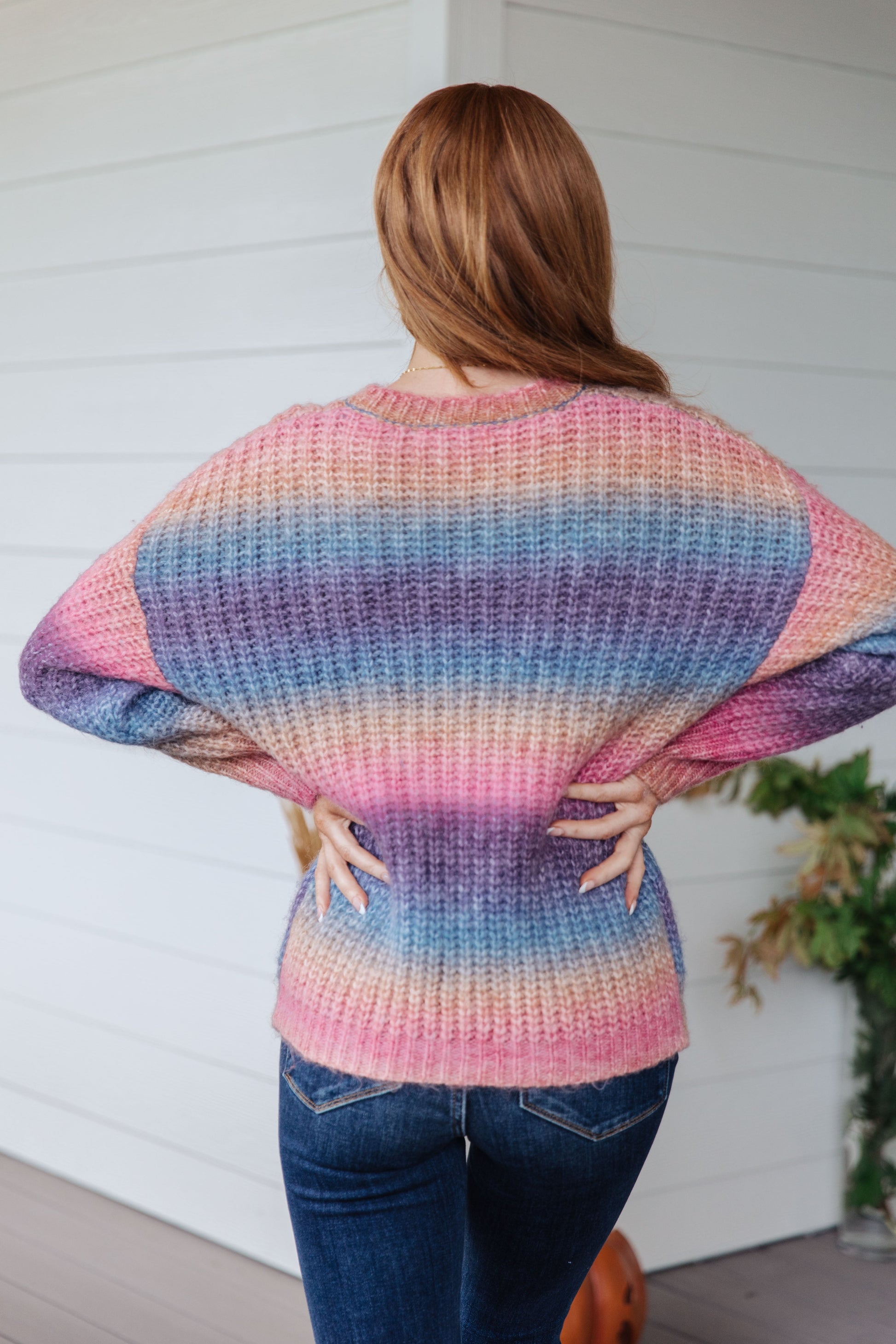 Stay cozy in style with this one-of-a-kind Make Your Own Kind of Music Rainbow Sweater. Boasting a beautiful ombre rainbow stripe, this chunky loose ribbed knit, soft sweater will have you singing in pure bliss. The drop shoulder design ensures all-day comfort and effortless style.