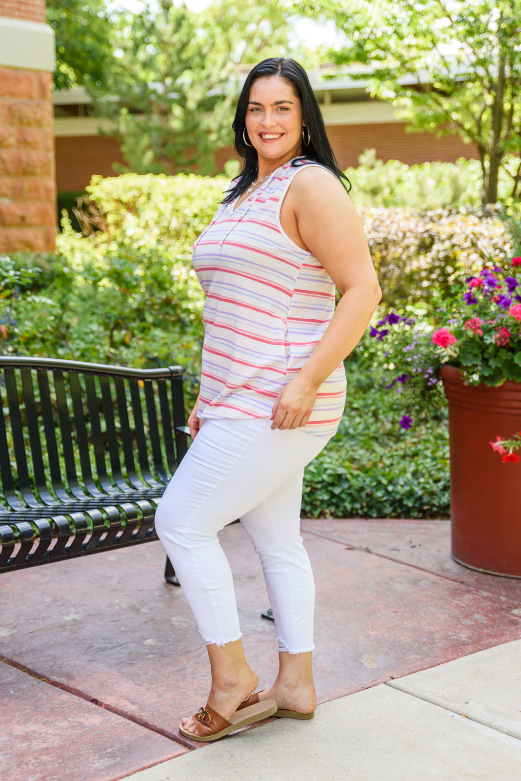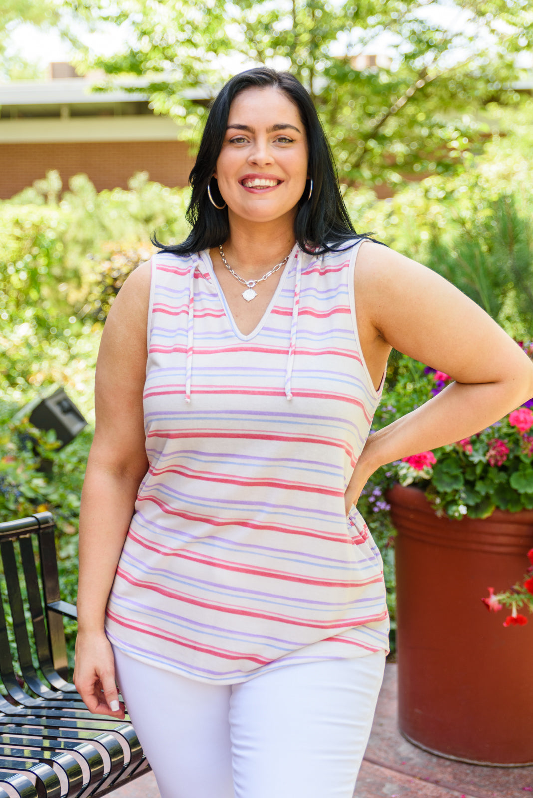 We are so excited to style our new Take A Day Off Hooded Tank! While it has endless styling options, we're pairing it with our bikini and denim cutoffs and heading to the pool! Featuring a notched neckline with faux drawstrings, stretchy soft fabric, and a fun hood in the back! With a sleeveless cut and flowy silhouette this makes for the perfect throw-on piece.