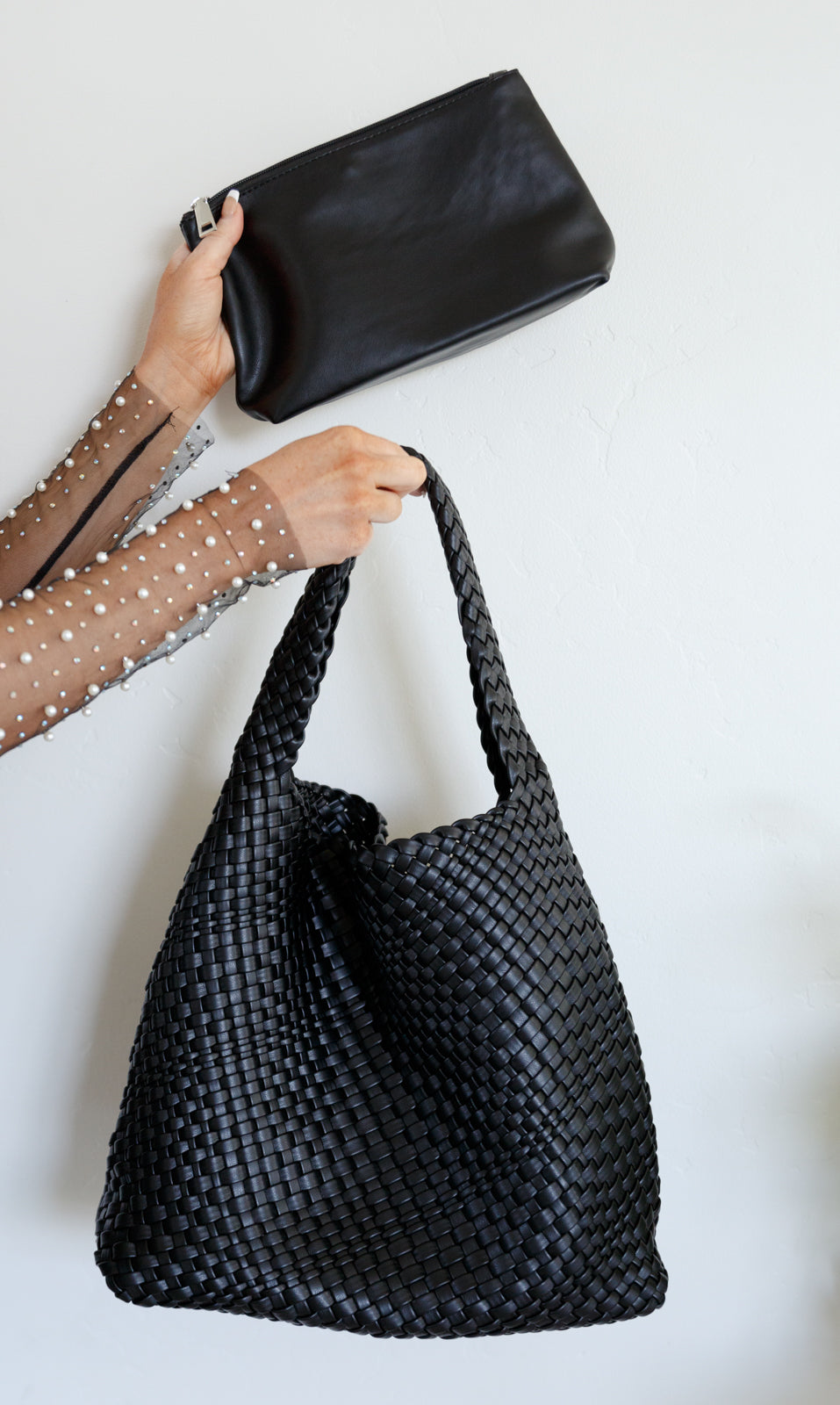 Elevate your everyday style with this stylish Woven and Worn Tote! Crafted from vegan leather with a basket weave, this fashionable hobo style bag radiates chic, confident style. Plus, the matching zippered clutch is the perfect complement for days when you're on the go. Elevate your fashion with this amazing two-piece set!