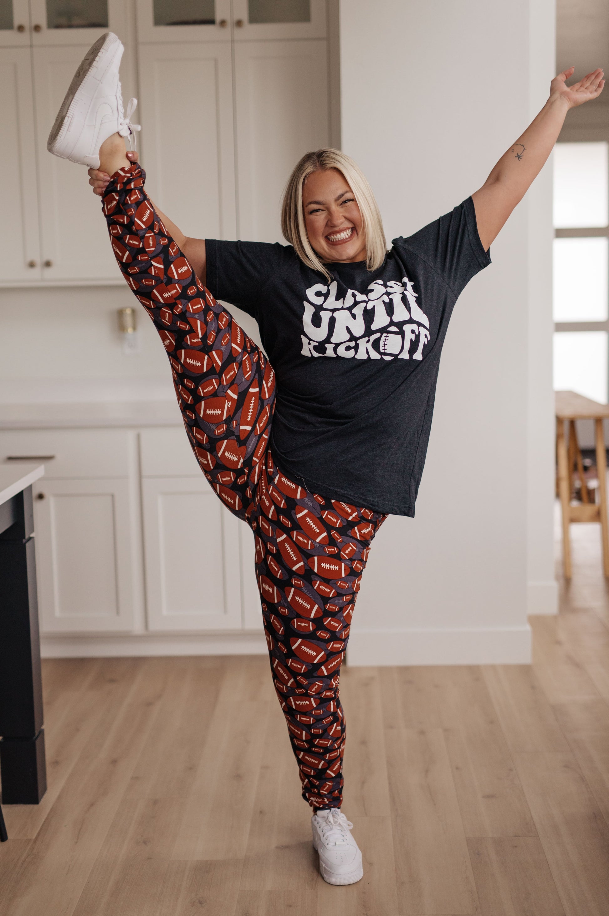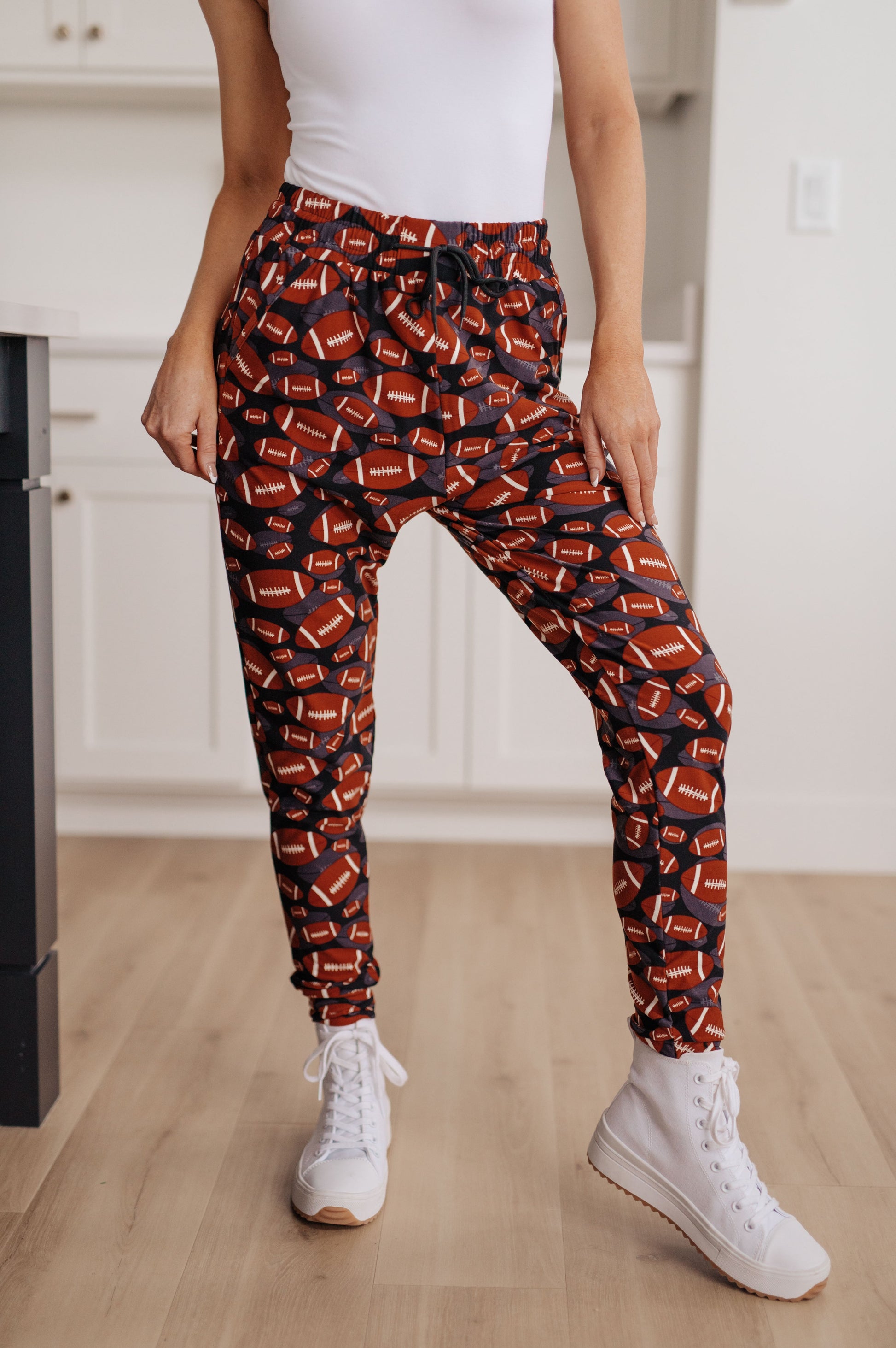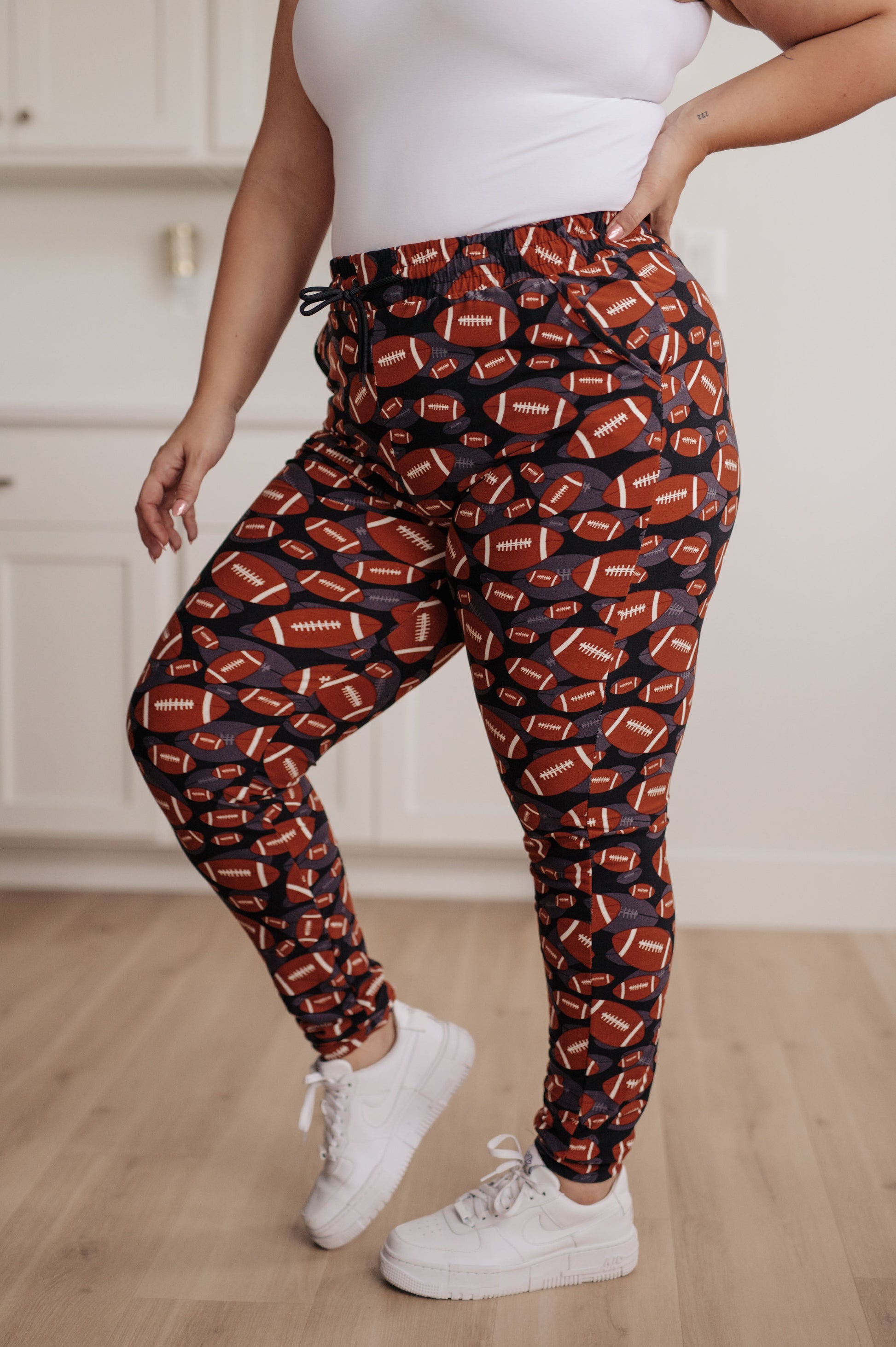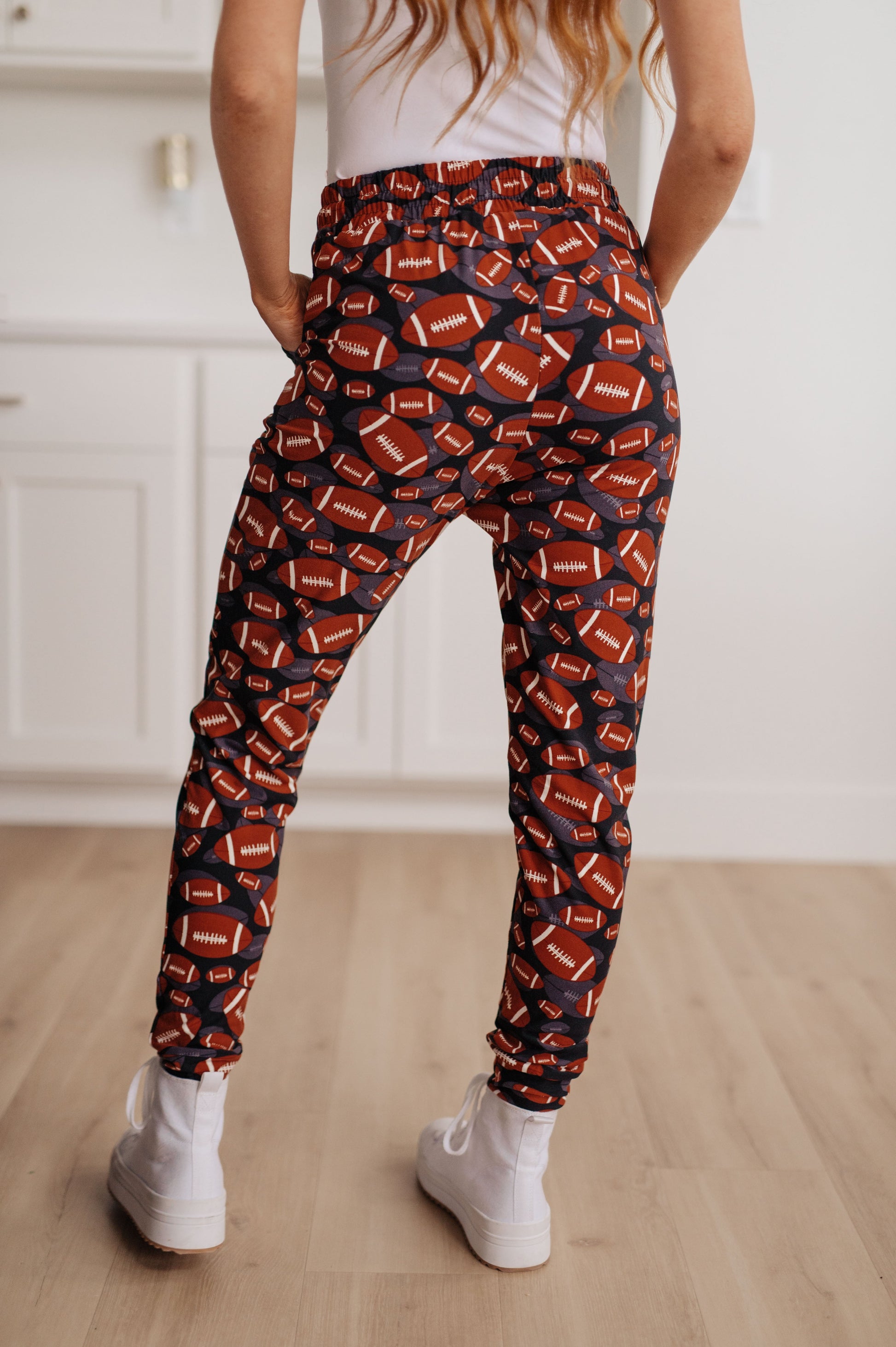 Introducing your new go-to loungewear: Your New Favorite Joggers in Football. Crafted for both comfort and style, these joggers feature a sporty football-inspired design! The buttery soft fabric, elastic waistband, and functional drawstring ensure a comfy fit and effortless relaxation. Pair them with our coordinating pullover or graphic tee for the ultimate game day ensemble, embracing comfort with a touch of athletic flair.